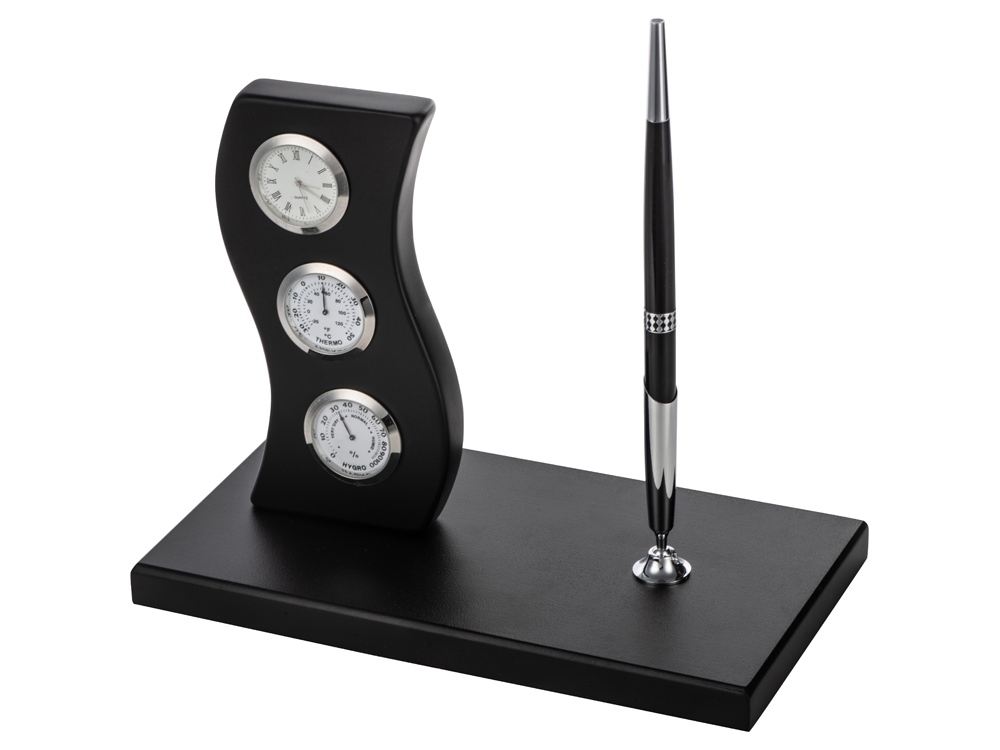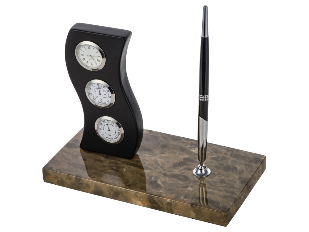 Замечательный прибор станет центральной фигурой рабочего стола руководителя. Настольный прибор оснащен держателем для ручки, шариковой ручкой, часами и небольшой метеостанцией. Удачное сочетание цветов и фактур не оставит равнодушным даже самых притязательных.