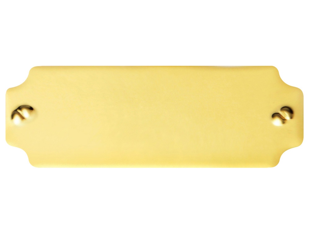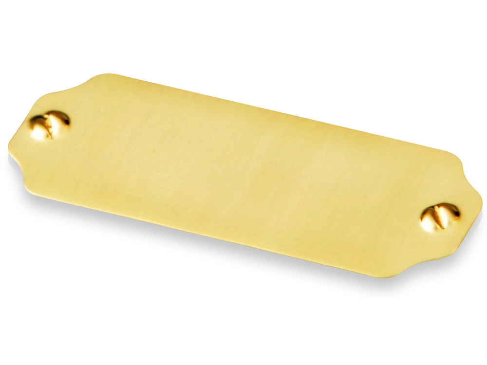 Фигурный шильд со скошенными углами позволяет красиво оформить оригинальный подарок, а золотистый цвет придает ему солидности. Небольшие размеры позволяют разместить шильд даже на фоторамке или небольшой визитнице.