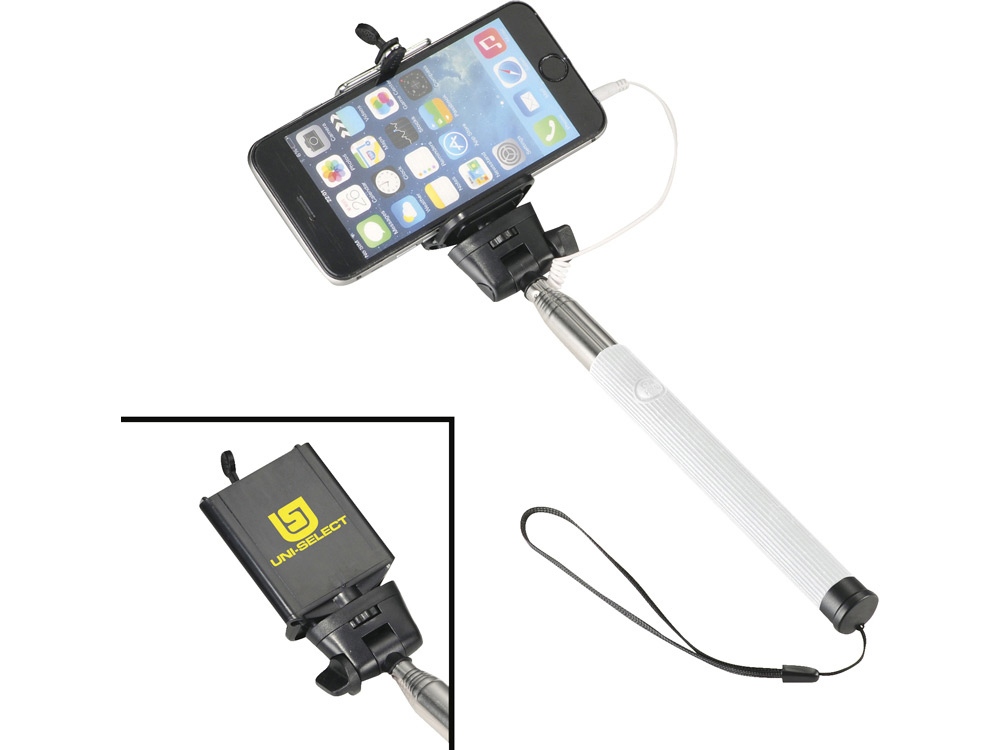 Проводной монопод. Сделайте идеальный селфи с этим выдвижным моноподом (до 90 см). Не требует батареи или использования приложения. Просто подключите 3,5 мм аудио разъем в телефон (совместим со всеми мобильными телефонами IOS) и нажмите на кнопку, расположенную на ручке. Регулируемый держатель телефона подходит для всех смартфонов. Силикон, сталь и ПВХ.