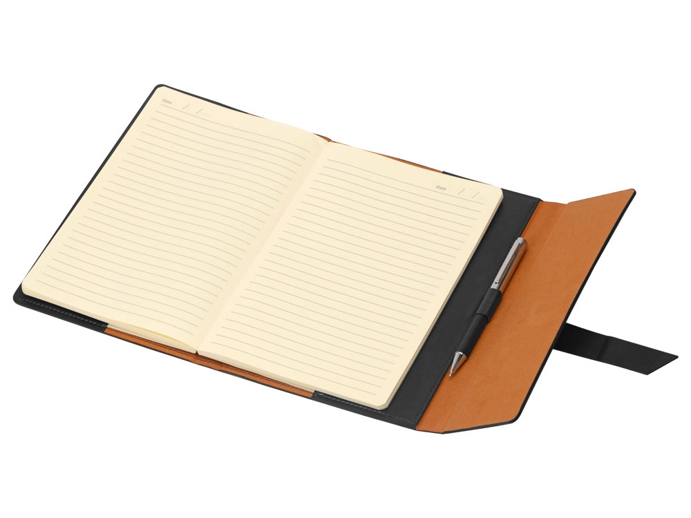 Бизнес-блокнот формата А5 в твердой обложке из искусственной кожи с ручкой в тон станет отличным подарком для любого клиента. Блокнот состоит из обложки с клапаном и сменного блока с линованными страницами.