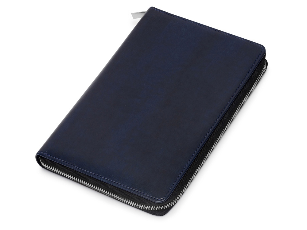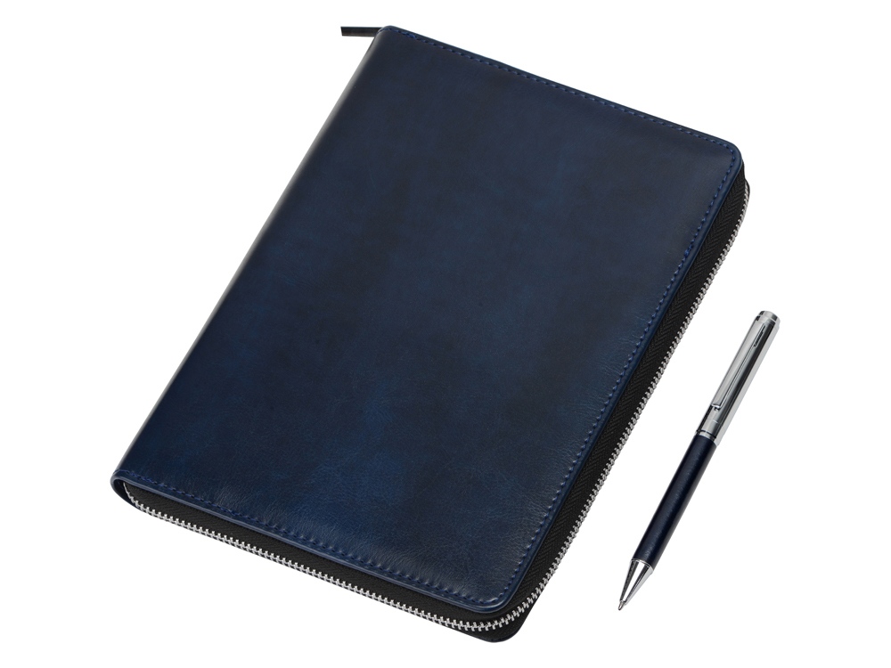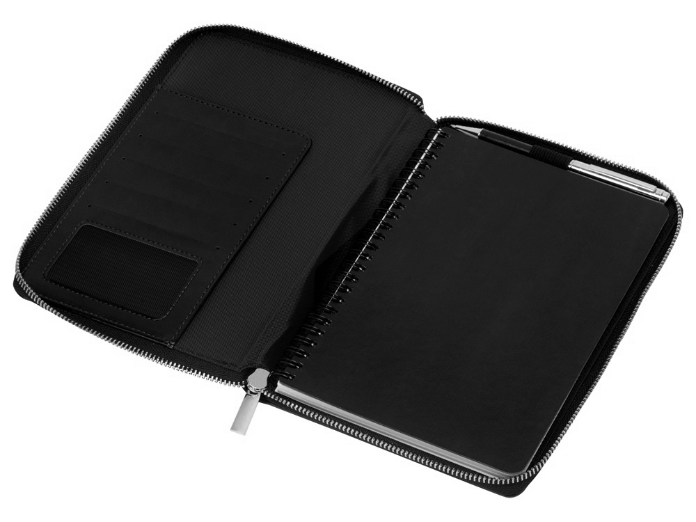 Бизнес блокнот Fabrizio состоит из пенала на молнии выполненного из искусственной кожи, и сменной тетради на 80 листов на кольцах с перфорированными линованными листами белого цвета.