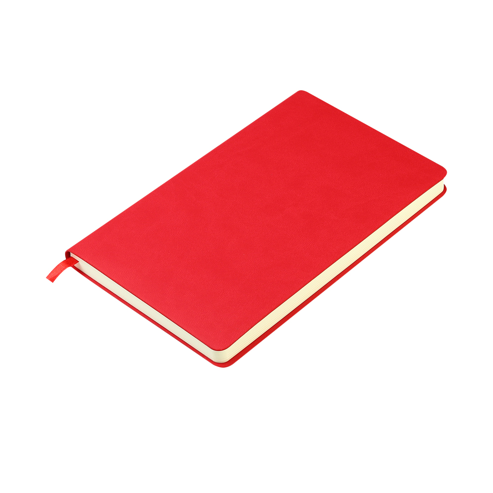 Блокнот формата А5 с мягким покрытием из PU-материала с имитацией рисунка кожи, с текстильной закладкой в цвет блокнота, 256 страниц, плотность 70г/м, страницы с черными линиями. Цвет по PANTONE® (максимально приближен): 186C.