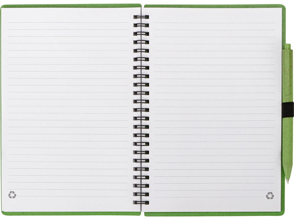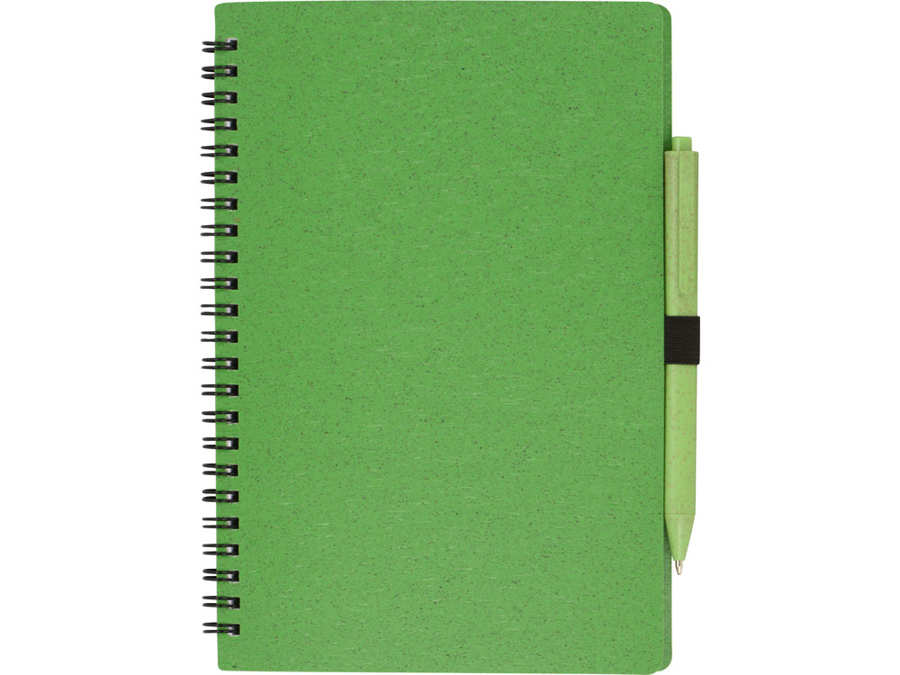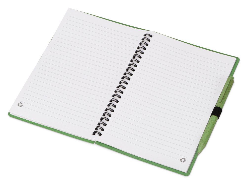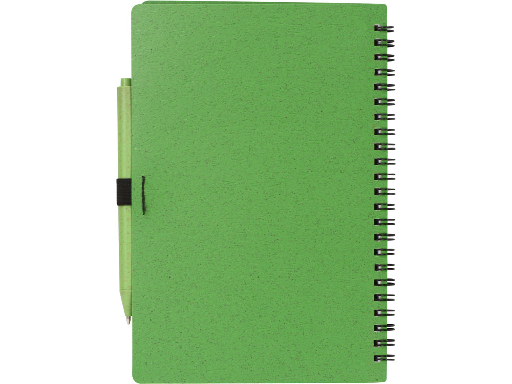 Блокнот с обложкой из переработанной пшеницы и пластика. Блок состоит из 80 листов переработанной бумаги белого цвета. Крепление - пружина. В комплекте шариковая ручка в тон блокноту из пшеничной соломы.