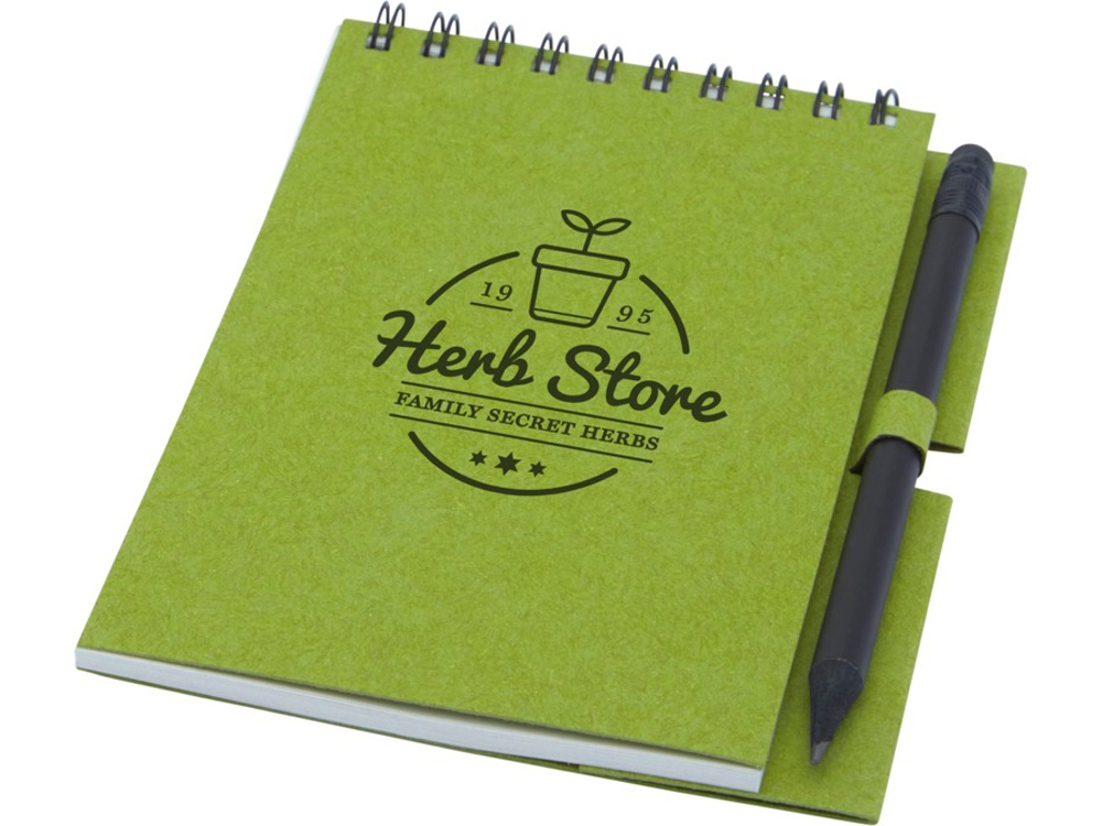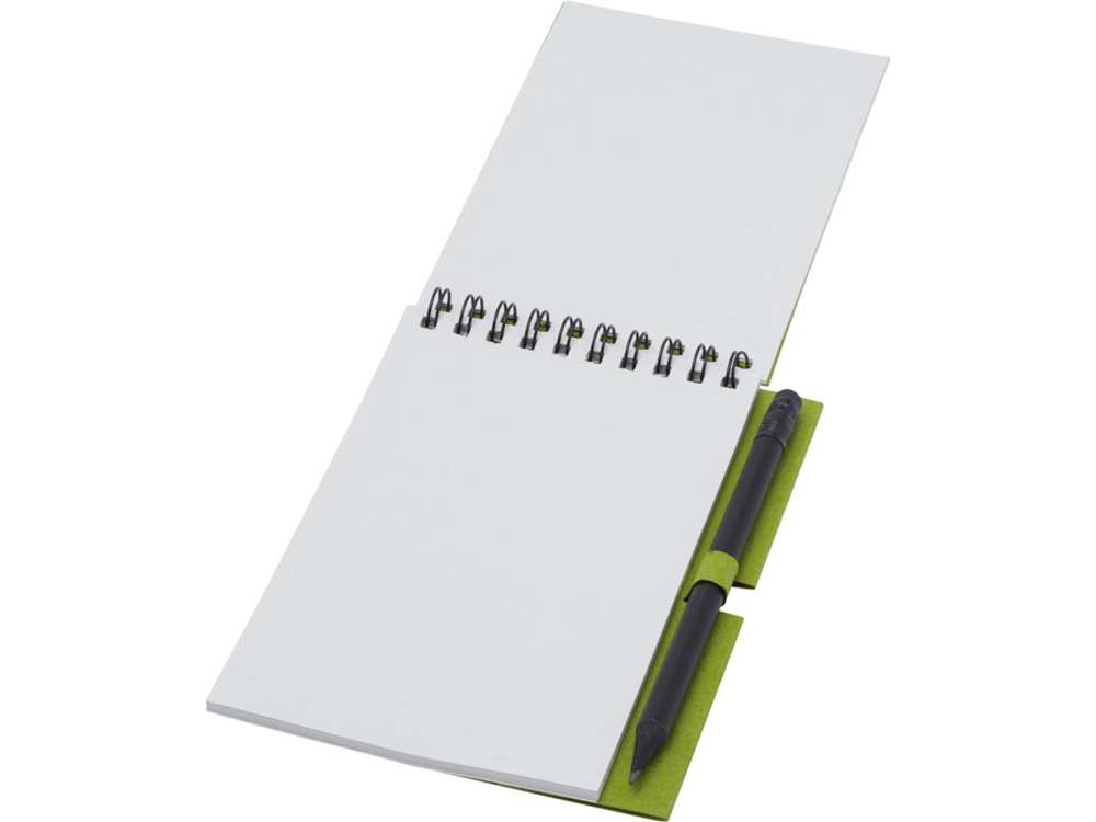 Блокнот на гребне из 40 листов плотностью 80 г/м², обложка и листы изготовлены из переработанной бумаги, соответствующей FSC, без декора. В комплект входит черный карандаш. Блокнот изготовлен в Италии.