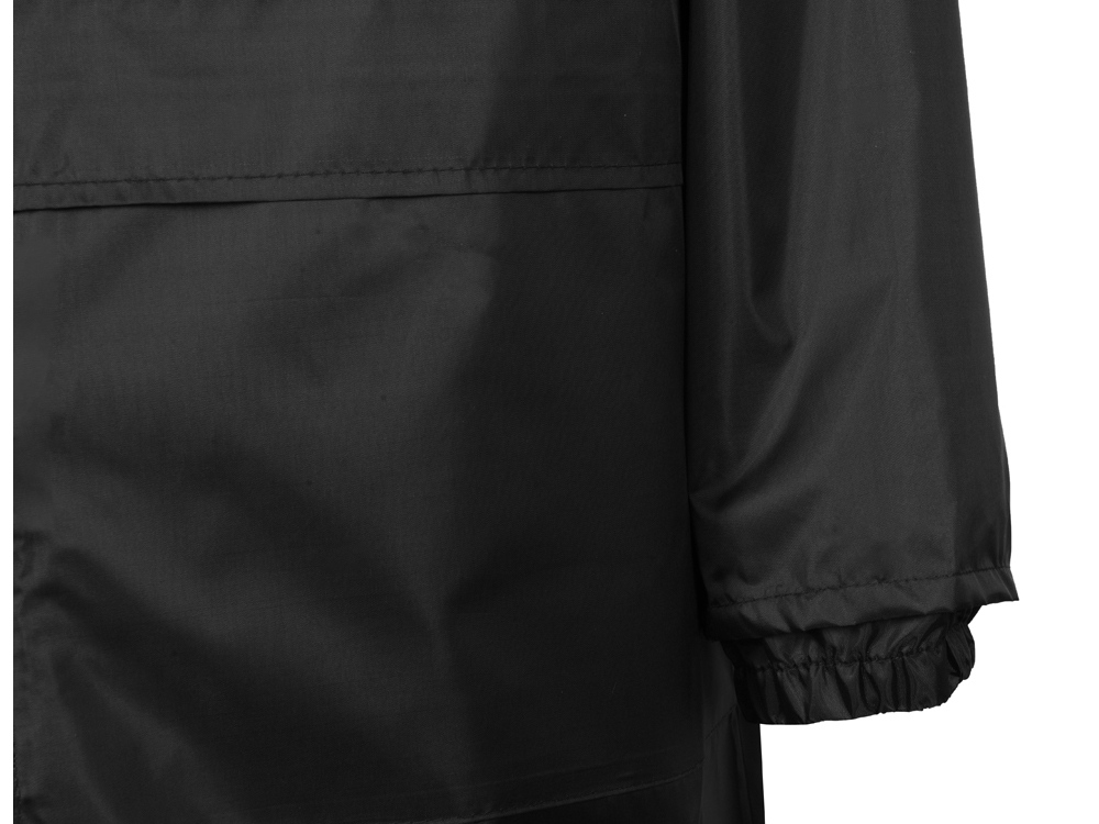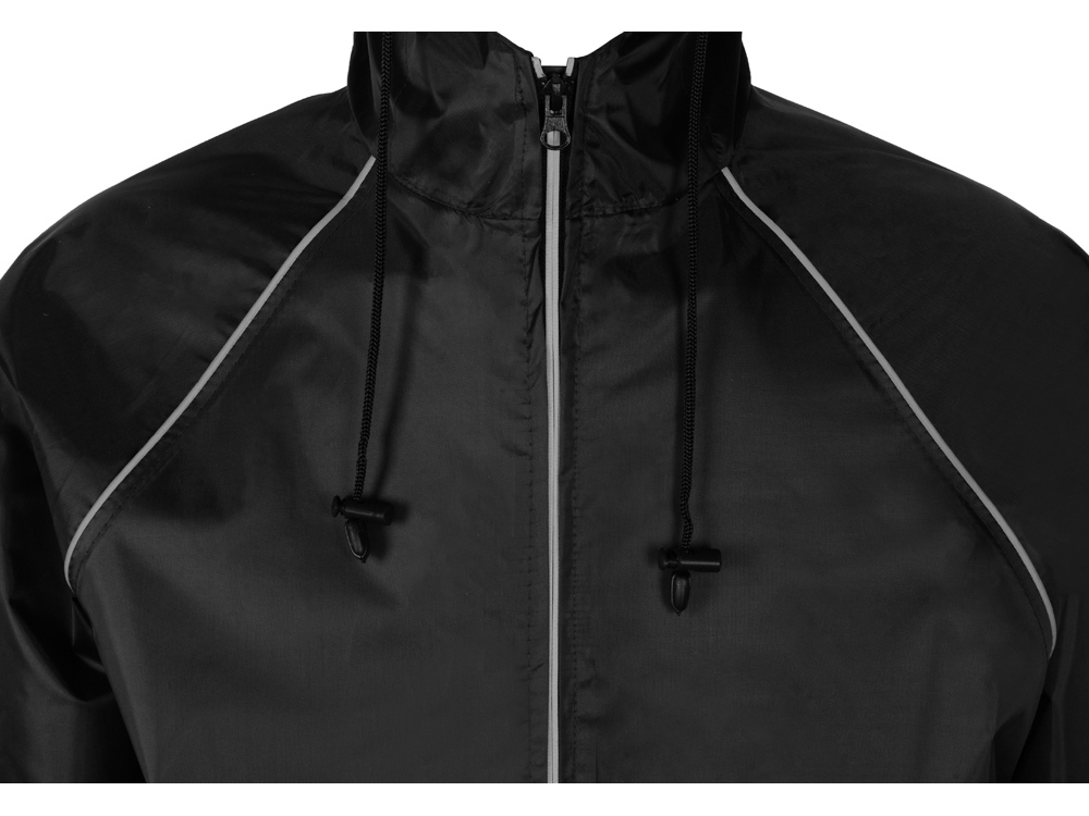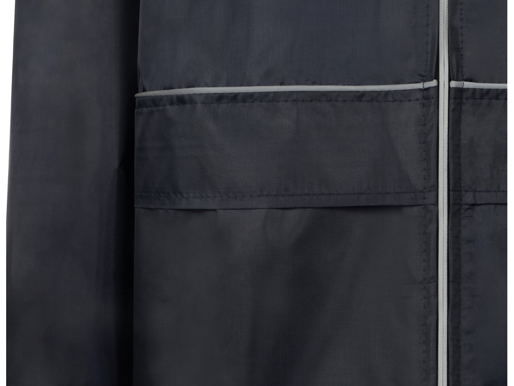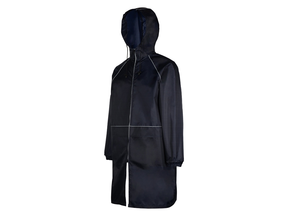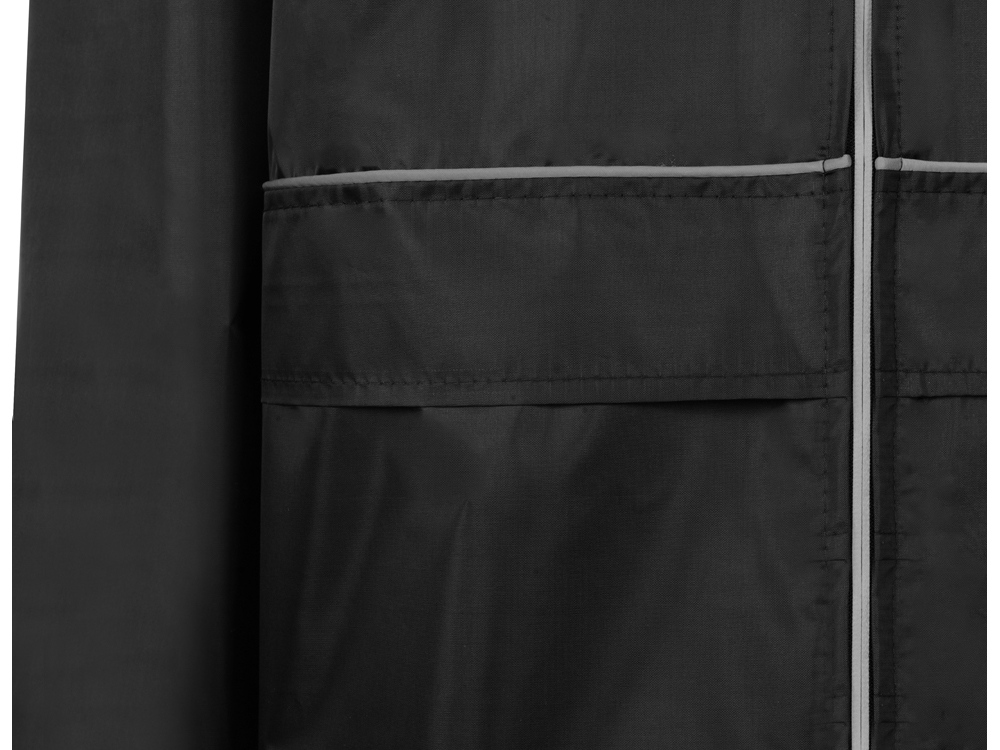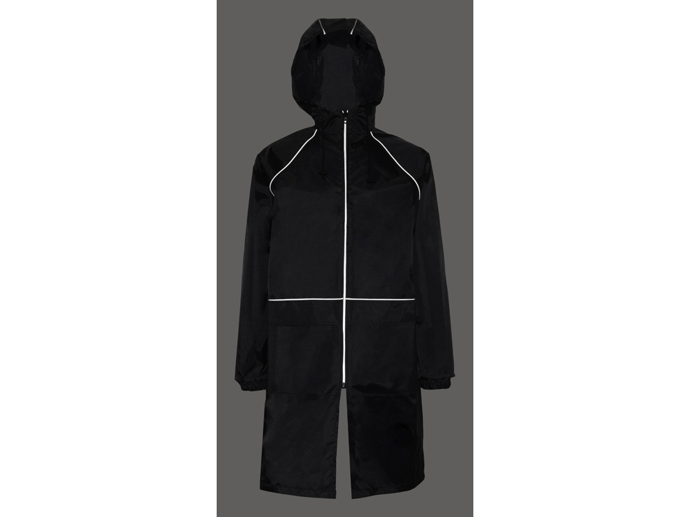 Плащ-дождевик прямого силуэта с капюшоном и рукавом реглан. Застегивается на центральную молнию со светоотражающей полосой с внутренней ветрозащитной планкой. Накладные карманами с клапанами. Двухшовный капюшон с кулиской по краю. Низ рукавов обработан манжетами с внутренней резинкой для комфортной посадке в области запястья. Верхний край клапана кармана, швы капюшона, а также регланные линии обработаны светоотражающим кантом.