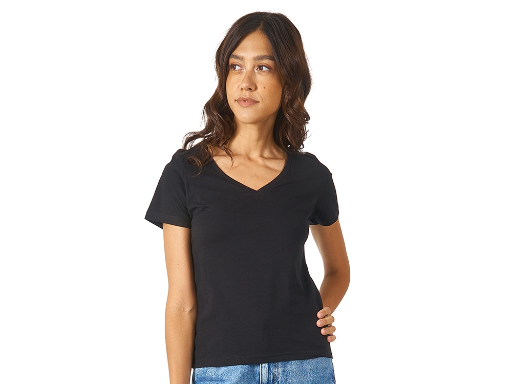 Женская футболка из натурального хлопка с элегантным V-образным вырезом. Материал отлично подходит для нанесения рекламной информации. Натуральная ткань не вызывает раздражения кожи.