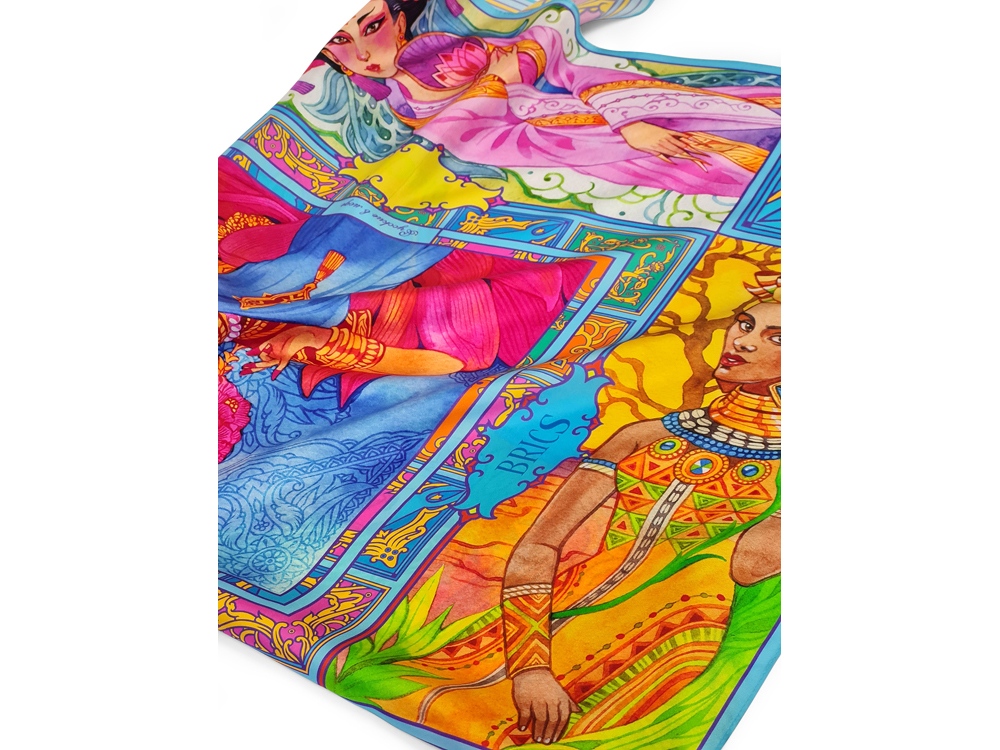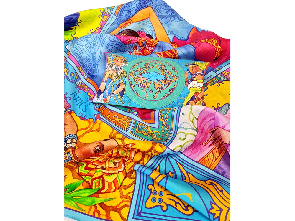 Представляем удивительный аксессуар - шелковый платок БРИКС, символ единства стран-членов альянса. В основу дизайна заложены народные костюмы Бразилии, России, Индии, КНР и ЮАР. Такие разные, не похожие друг на друга культуры, складываются как пазл в единую, гармоничную картину. Наше изделие - творческое воплощение идеи многополярности мира, знамя дружбы и равенства всех стран-участниц международного объединения БРИКС. В нем, как в хороводе, пестрят костюмами и красотой девушки - олицетворение прекрасных представительниц интернационального союза. Уже 5 лет в рамках объединения существует Женский деловой Альянс, участницам которого мы посвящаем наш новый дизайн. Мы надеемся, что этот яркий атрибут станет постоянной деталью Вашего образа, подчеркнет красоту и яркость своей обладательницы.