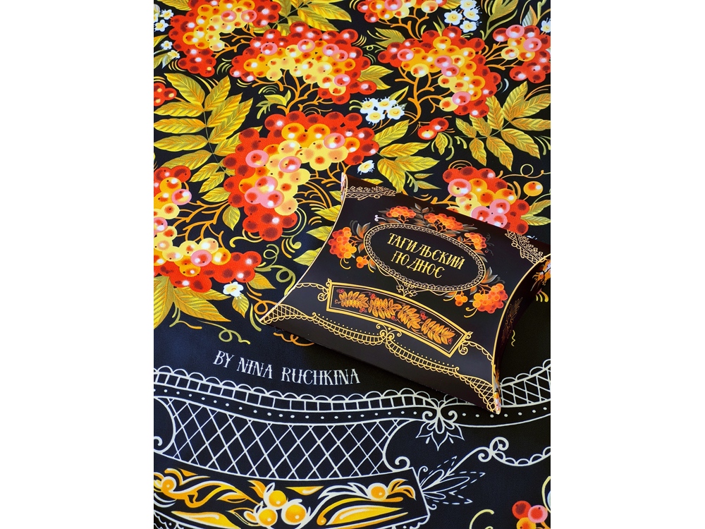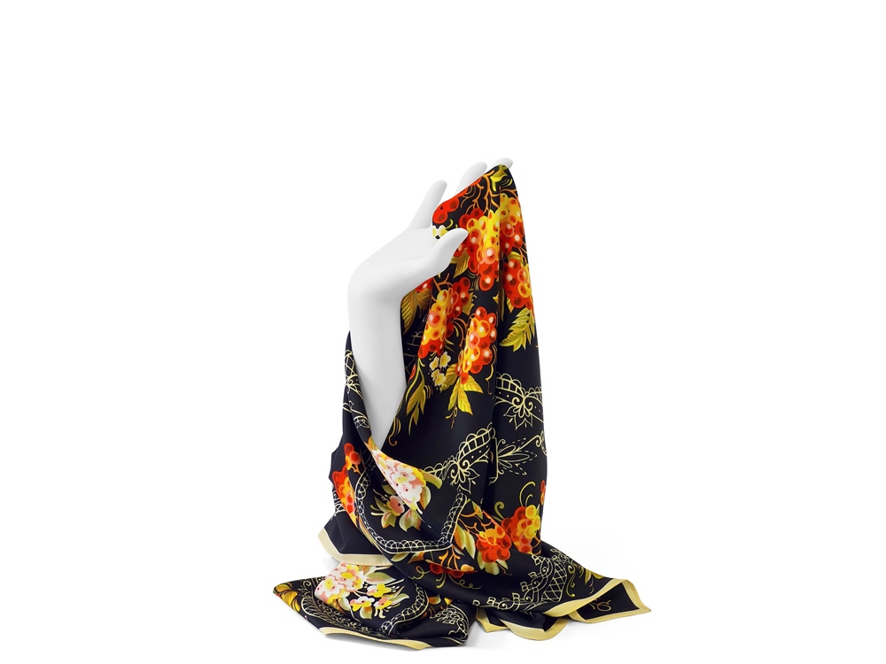 Платок Тагильский поднос станет ярким акцентом в вашем гардеробе. Насыщенная терракотово-чёрная цветовая гамма плодов всегда актуальна, а нежные оттенки цветов рябины внесут настроение романтичности и легкости.