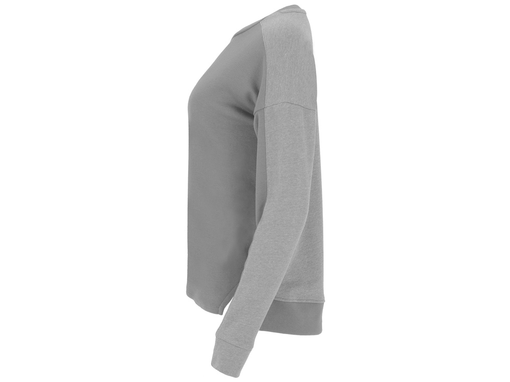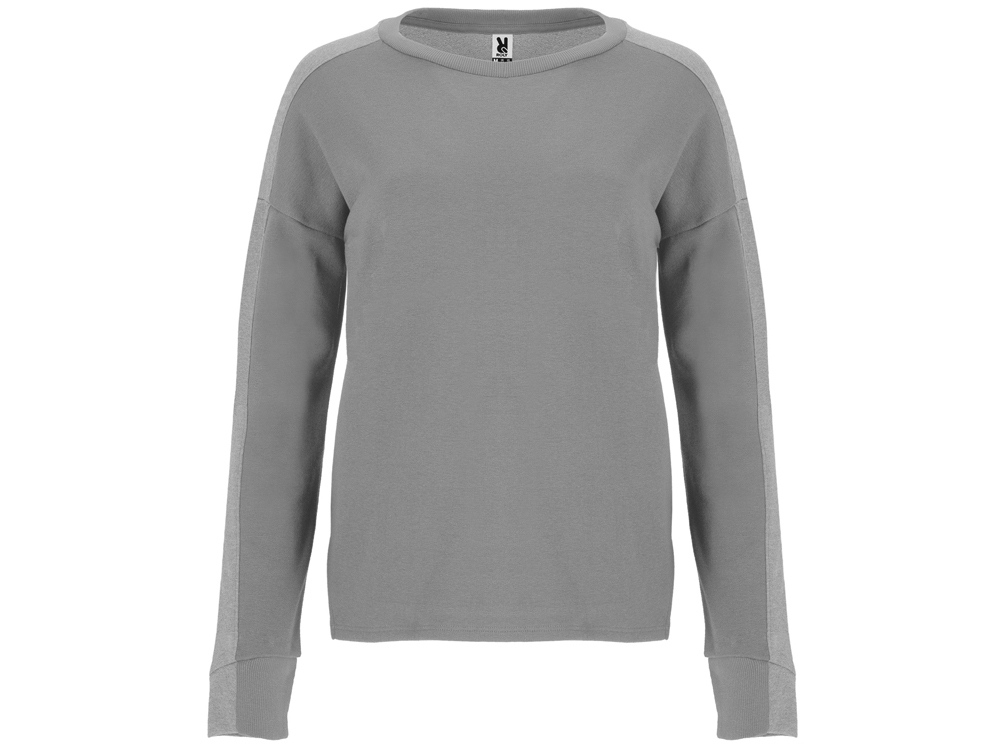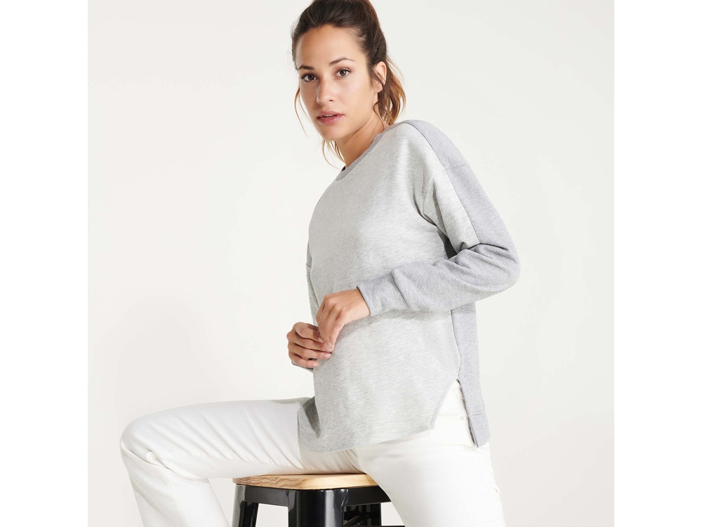Блокинговый свитшот для женщин из двух цветов одного полотна. Горловина, манжеты и низ спинки из риба 2х1. Манжеты асимметричной формы. Разрезы в боковых швах, спинка немного длиннее переда.