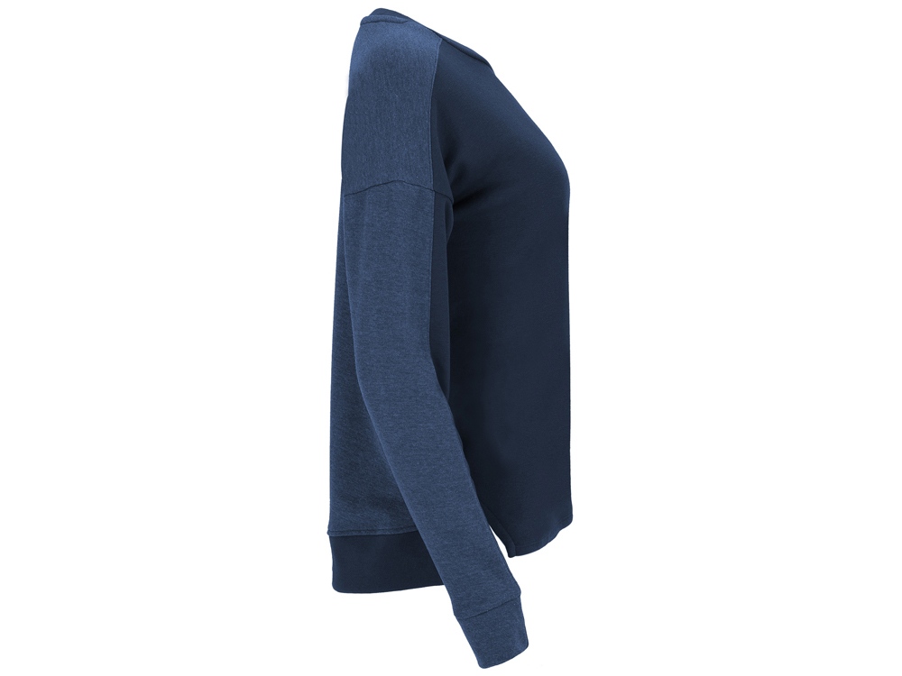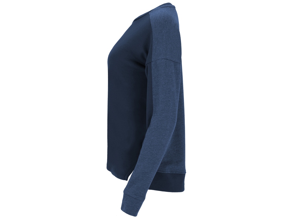 Блокинговый свитшот для женщин из двух цветов одного полотна. Горловина, манжеты и низ спинки из риба 2х1. Манжеты асимметричной формы. Разрезы в боковых швах, спинка немного длиннее переда.