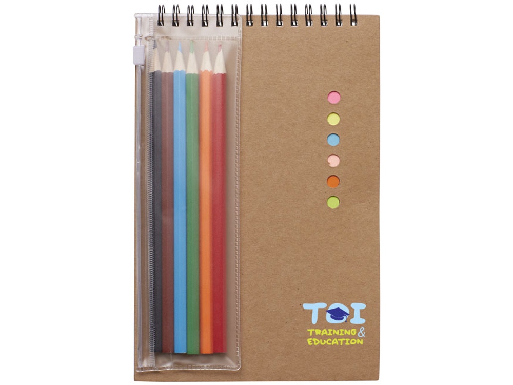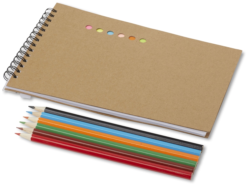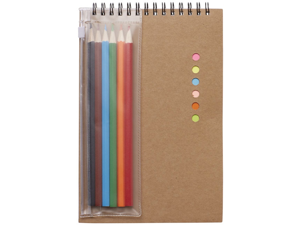 Набор для раскрашивания Hoppi. В наборе 6 небольших блоков для заметок, средний желтый блок для заметок, 10 страниц для раскрашивания, 30 пустых страниц и 6 цветных карандашей. Бумага.