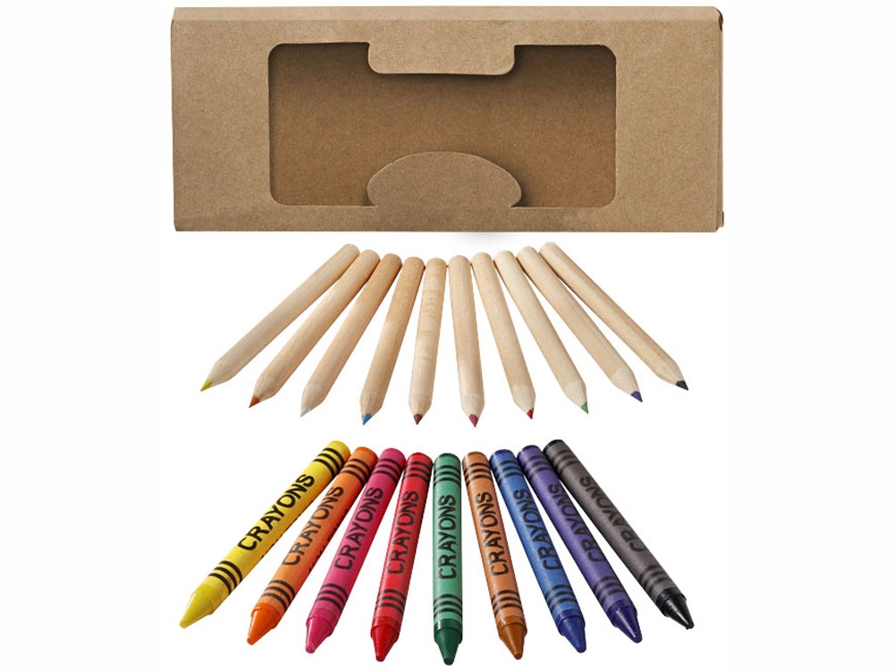 Набор из 19 карандашей. 9 цветных восковых карандашей и 10 цветных карандашей в картонной коробке с пластиковым окошком. Нанесение не предлагается на отдельные элементы набора. Картон.
