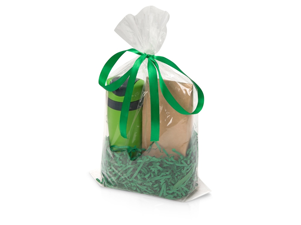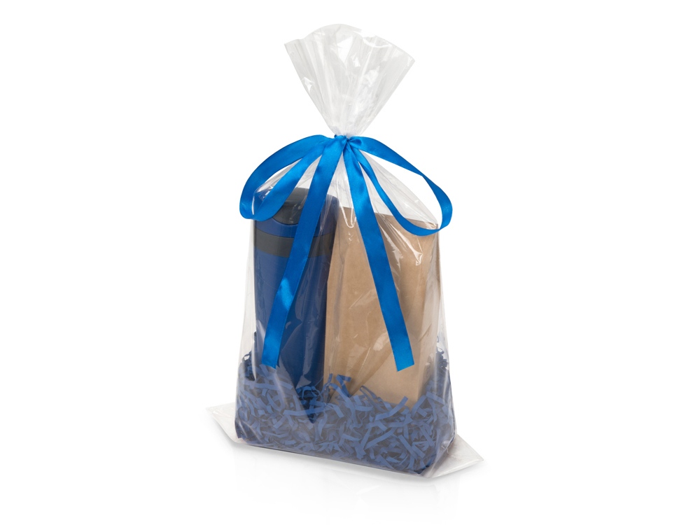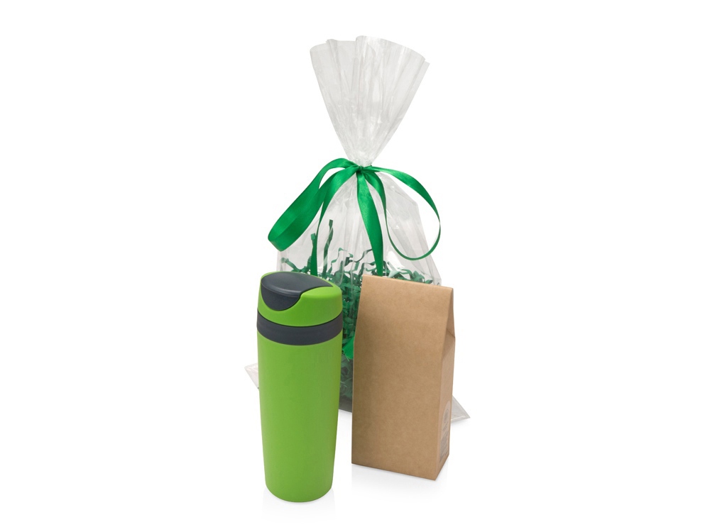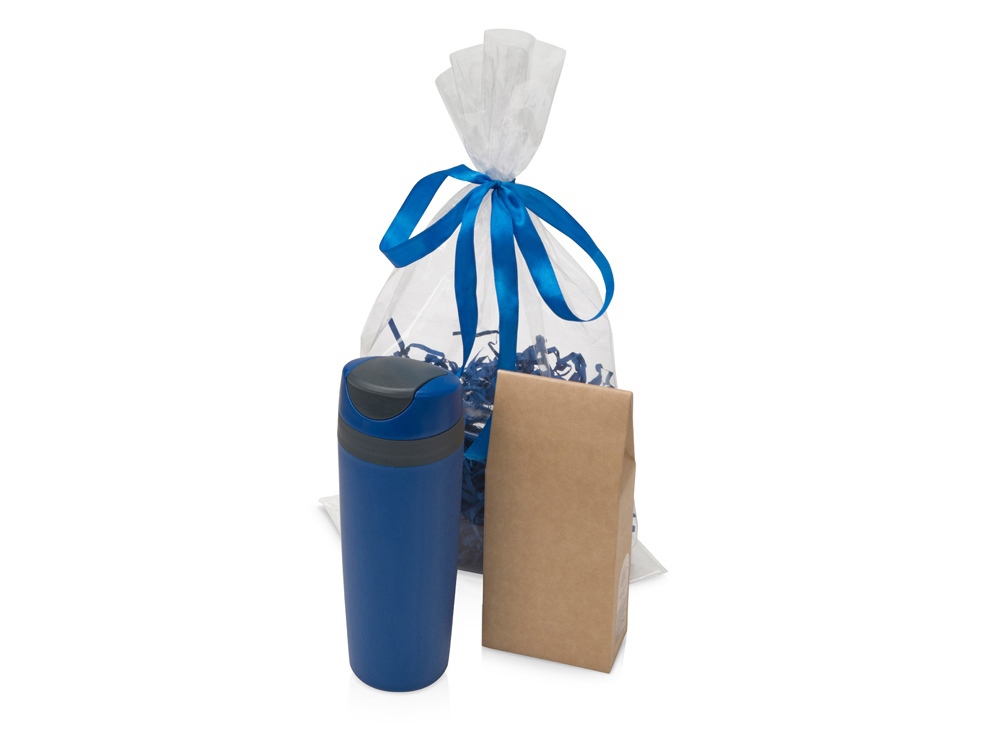 Набор состоит из пачки кофе и термокружки. Набор упакован в полиэтиленовый пакет с бумажным наполнителем и подвязан атласной лентой.