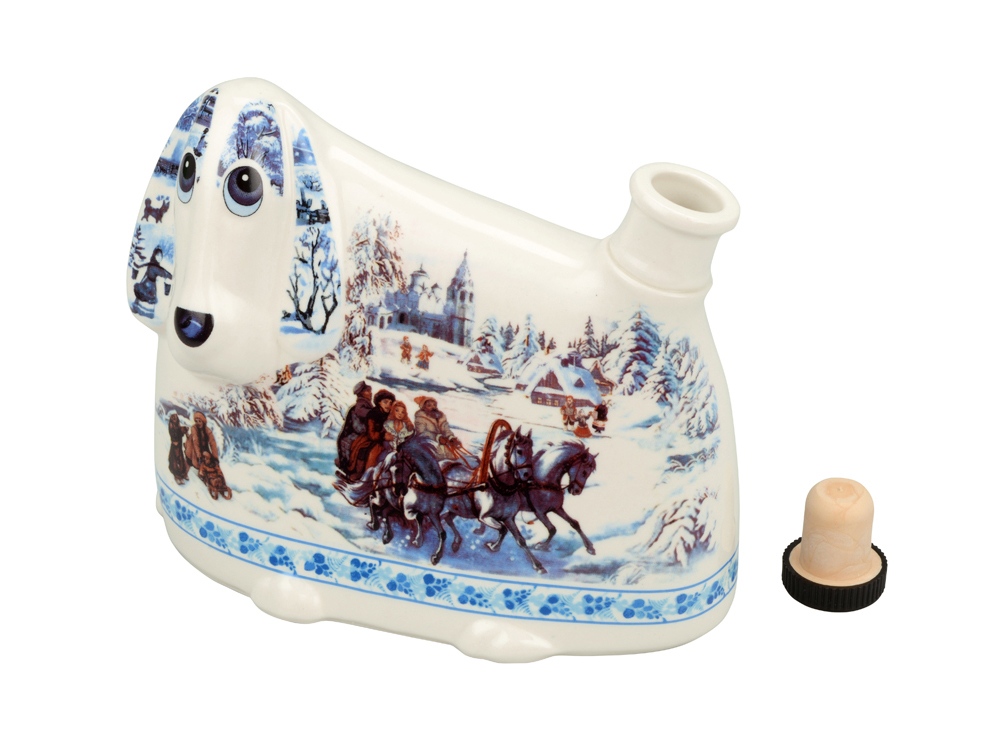 Вам нужен настоящий подарок в русском стиле? Нестандартный и очень душевный подарок штоф в виде собаки, с изображением традиционной русской забавы – катание на тройке. Роспись штофа выполнена в духе традиционного народного промысла. Штоф изготовлен из высококачественного фарфора. Превосходное мастерство росписи обеспечит долгое использование данного штофа. Объем штофа 500 мл. Упаковка – подарочная коробка из дизайнерской бумаги синего цвета с металлизированными наклейками.
