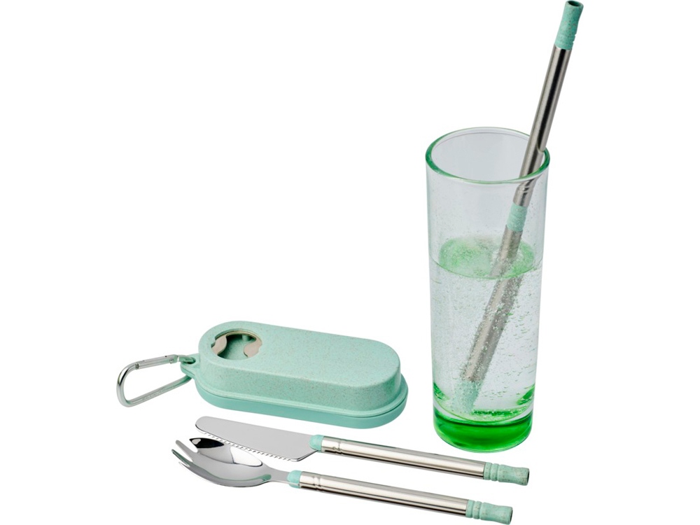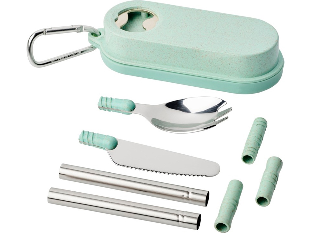 Переносной набор столовых приборов для удобного приема пищи на ходу. Столовые приборы поставляются отдельно для компактного хранения и легкой сборки. Состоит из ножа, ложки, вилки, соломенной трубочки и футляра для переноски. Солома — это стебли зерновых, использование которых позволяет сократить количество пластика в изделии. 20% Wheat straw, 20% Пластик PP, 20% нержавеющая сталь, 20% Железо, 20% Силиконовый Пластик.