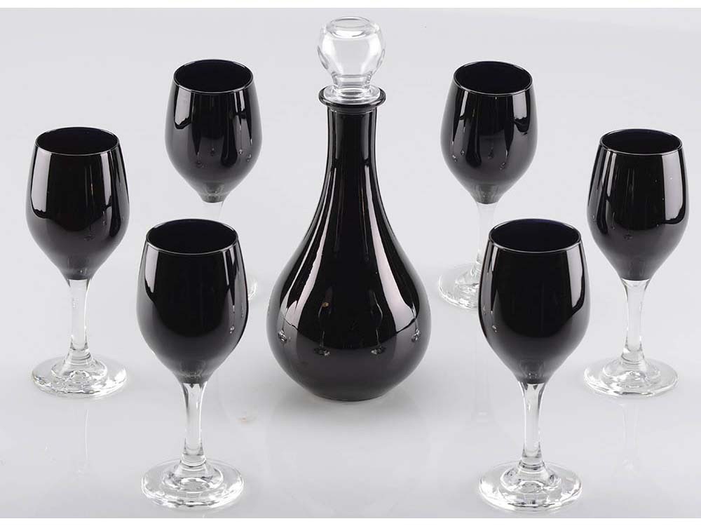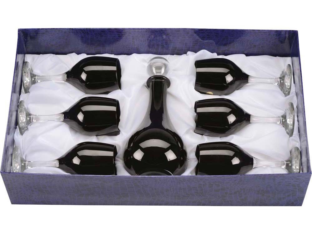 Подарочный набор посуды для вина включает в себя 6 бокалов и графин. Набор выполнен из тонкого прозрачного и черного стекла. Ручная работа. Плавность форм и изумительный внешний вид не оставит равнодушным даже самых требовательных людей.