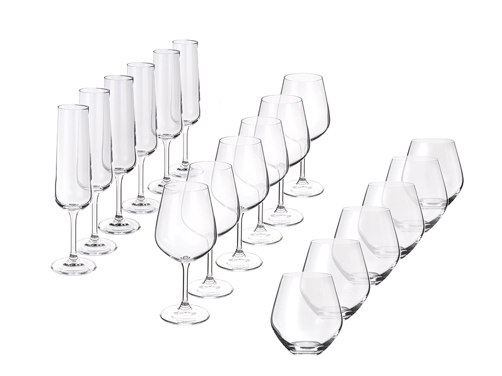 Набор бокалов состоит из 18 предметов - из шести бокалов-флютов для игристых вин, из шести бокалов для красного вина и из шести бокалов без ножки для разных видов напитков, в частности, для коктейлей. Все бокалы выполнены из бессвинцового хрусталя, экологически чистого материала, который сохраняет кристальную прозрачность, не тускнея и не мутнея.