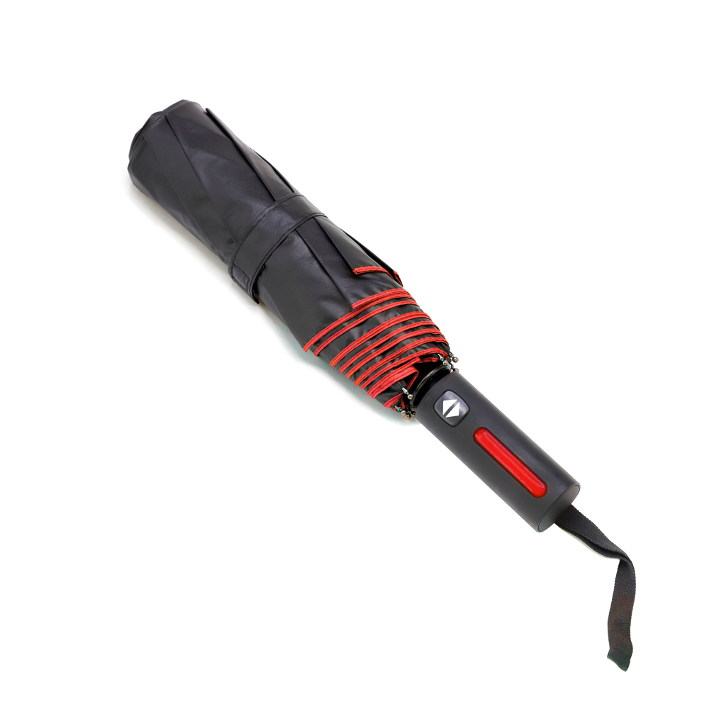 Автоматический противоштормовой складной зонт Sherp. Материал купола – эпонж. На таком материале вода превращается в капельки и скатывается, а сам зонт остается сухим. Цветной элемент на ручке – в тон купола. Ветрозащитная функция – спицы из стекловолокна, а специальное устройство препятствует поломке спиц при резких порывах ветра.