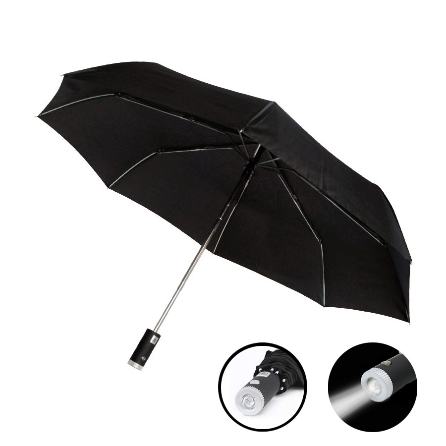 Автоматический зонт 2 в 1. Выполняет свою непосредственную функцию, а также осветит вам дорогу темным вечером. В ручку встроен фонарик. Внимание! Батарейки (3 шт. х LR44) не входят в комплект и приобретаются отдельно. Материал купола – эпонж, каркас – стекловолокно.