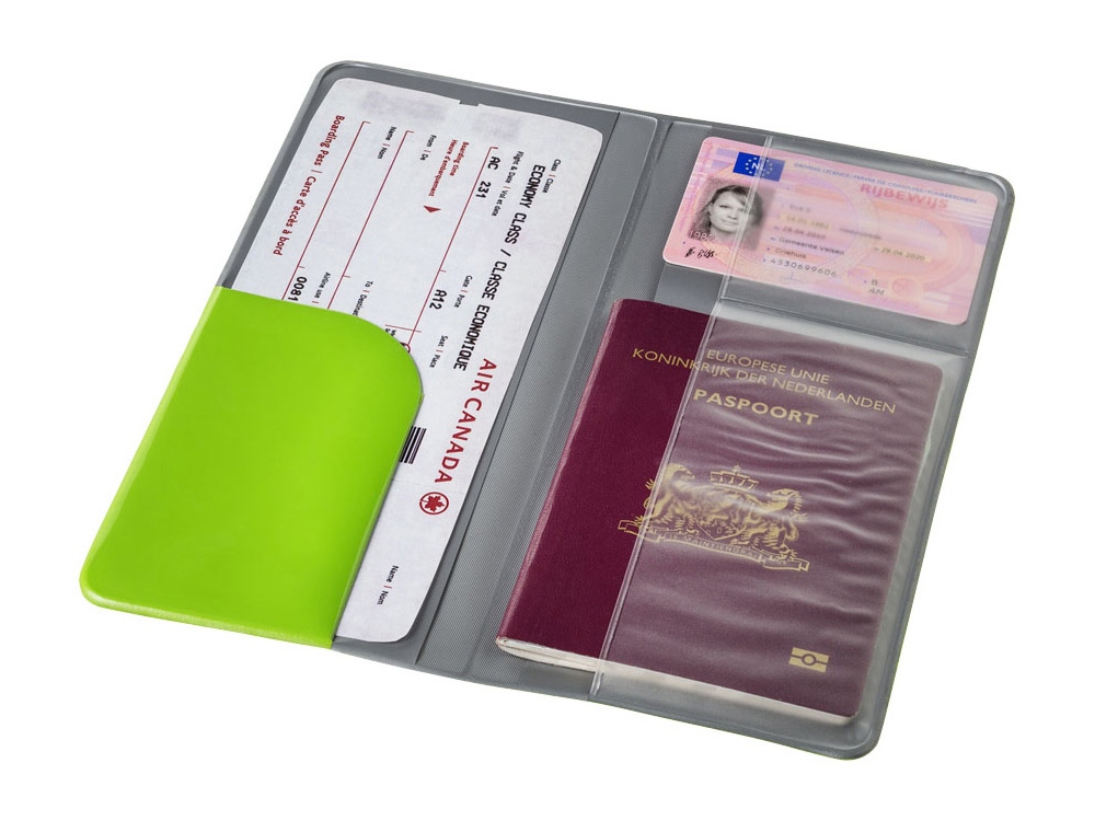 Дорожное портмоне Voyageотлично подходит для защиты документов во время путешествий и деловых поездок. Пластиковые карманы для паспорта и посадочного талона. Три варианта расцветки: черный, синий и ярко-зеленый. Возможно нанесение оригинального дизайна.
