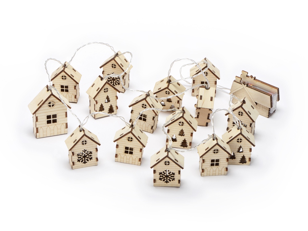 Светодиодная новогодняя елочная гирлянда постоянного свечения с домиками из натуральной березовой фанеры. Работает от 2-х батареек АА (в комплекте).