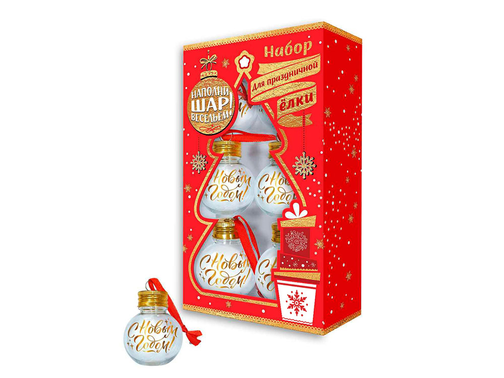 Набор новогодних шаров Наполнитель – оригинальная идея подарка и необычный декор для елки. Верхняя часть игрушки легко снимается, и наполнить шар можно чем угодно на Ваш выбор. Каждый шар украшен поздравлением и ленточкой для подвешивания. Всего в наборе 6 шариков.