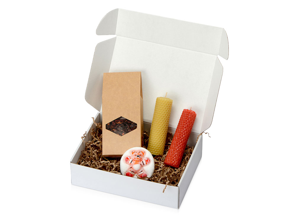 Новогодний набор состоит из ароматного чая, двух свечей из вощины разных цветов и мыла ручной работы в виде тигренка, символа 2022 года. Каждый из компонентов набора имеет все шансы обрадовать вашего адресата: чай создаст праздничное настроение, свечи из вощины при горении наполнят дом сладким запахом меда, а забавный тигренок да Винчи вызовет улыбку и настроит на новогодний лад. Комплект упакован в белую картонную коробку.