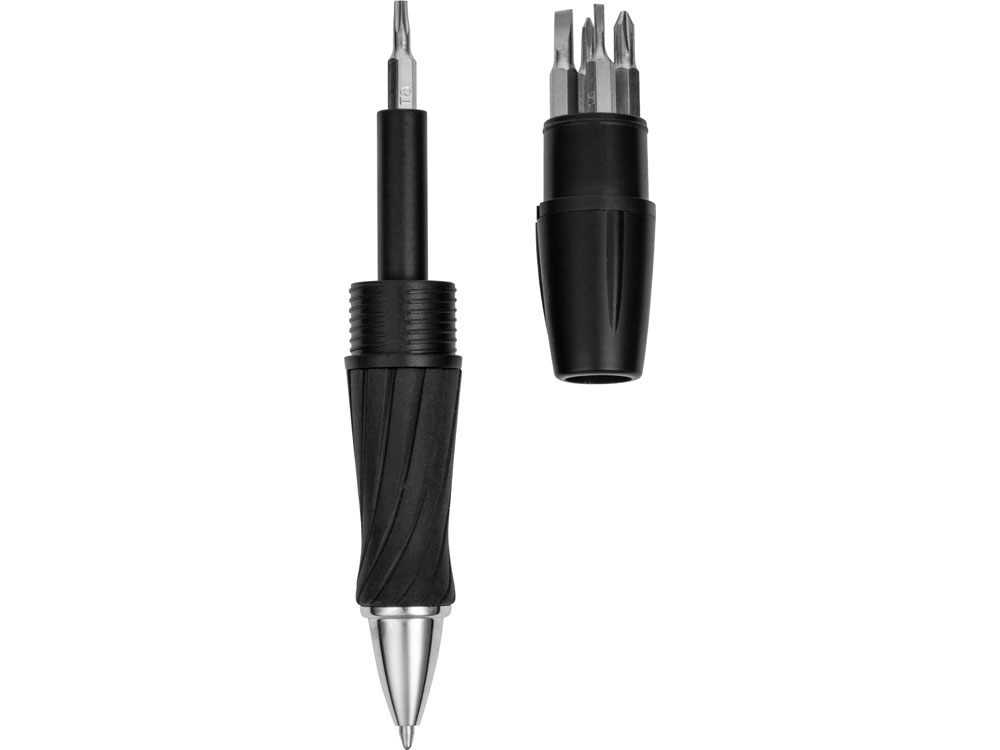 Инструмент Joker 7-в-1 с ручкой и фонариком. Шариковая ручка с поворотным механизмом, корпус- холдер для 5-ти насадок отверток. Светодиодный фонарик с поворотным включением. Батарейки в комплекте. АБС пластик.