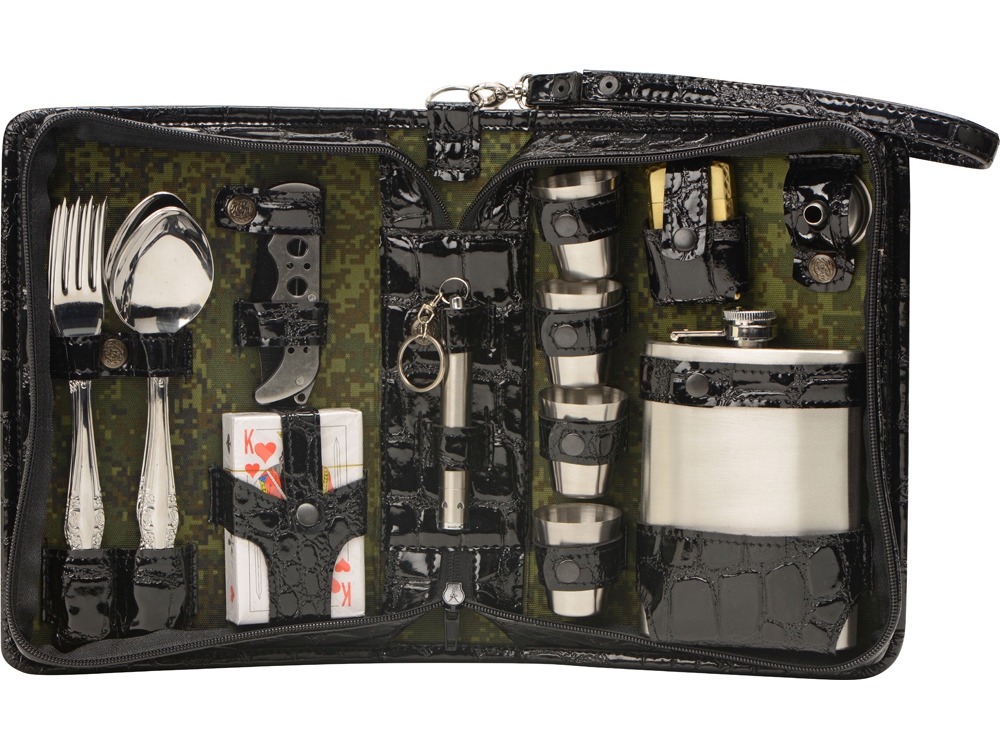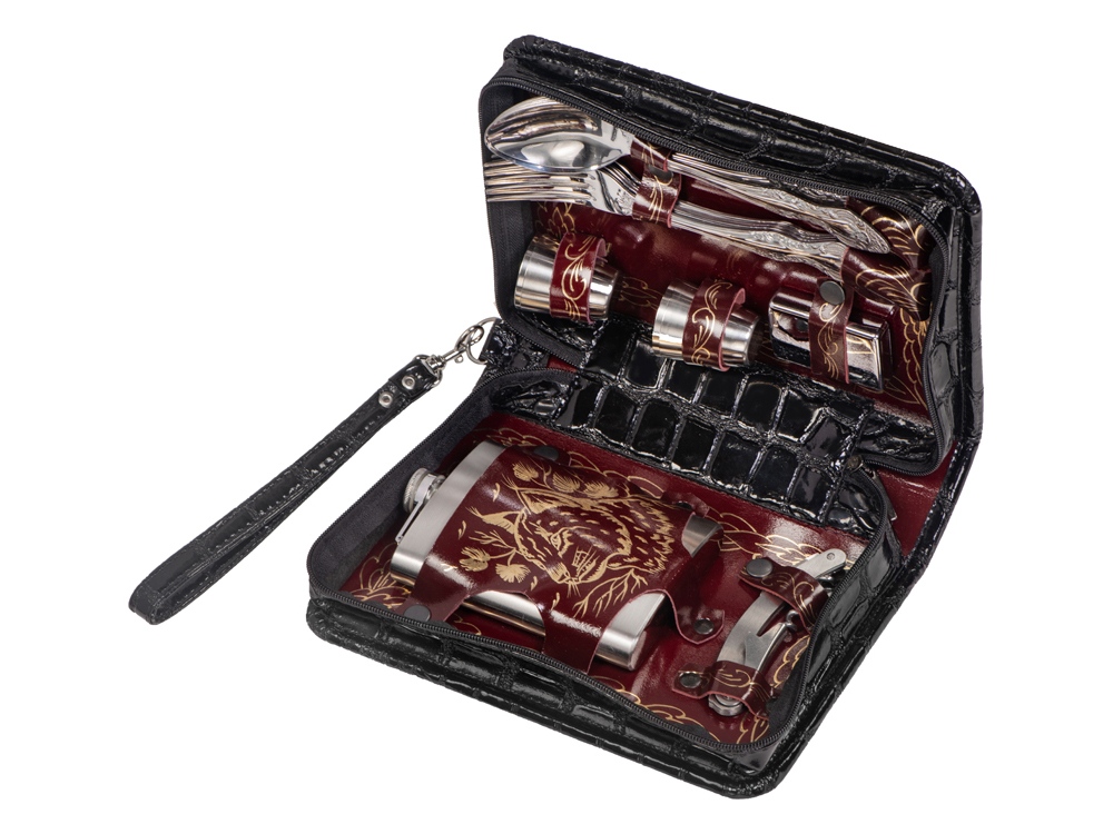 Оригинальный дорожный набор на 4 персоны в барсетке с удобным ремешком для переноски. Барсетка из искусственной кожи, отделка- натуральная кожа с художественным выжиганием.